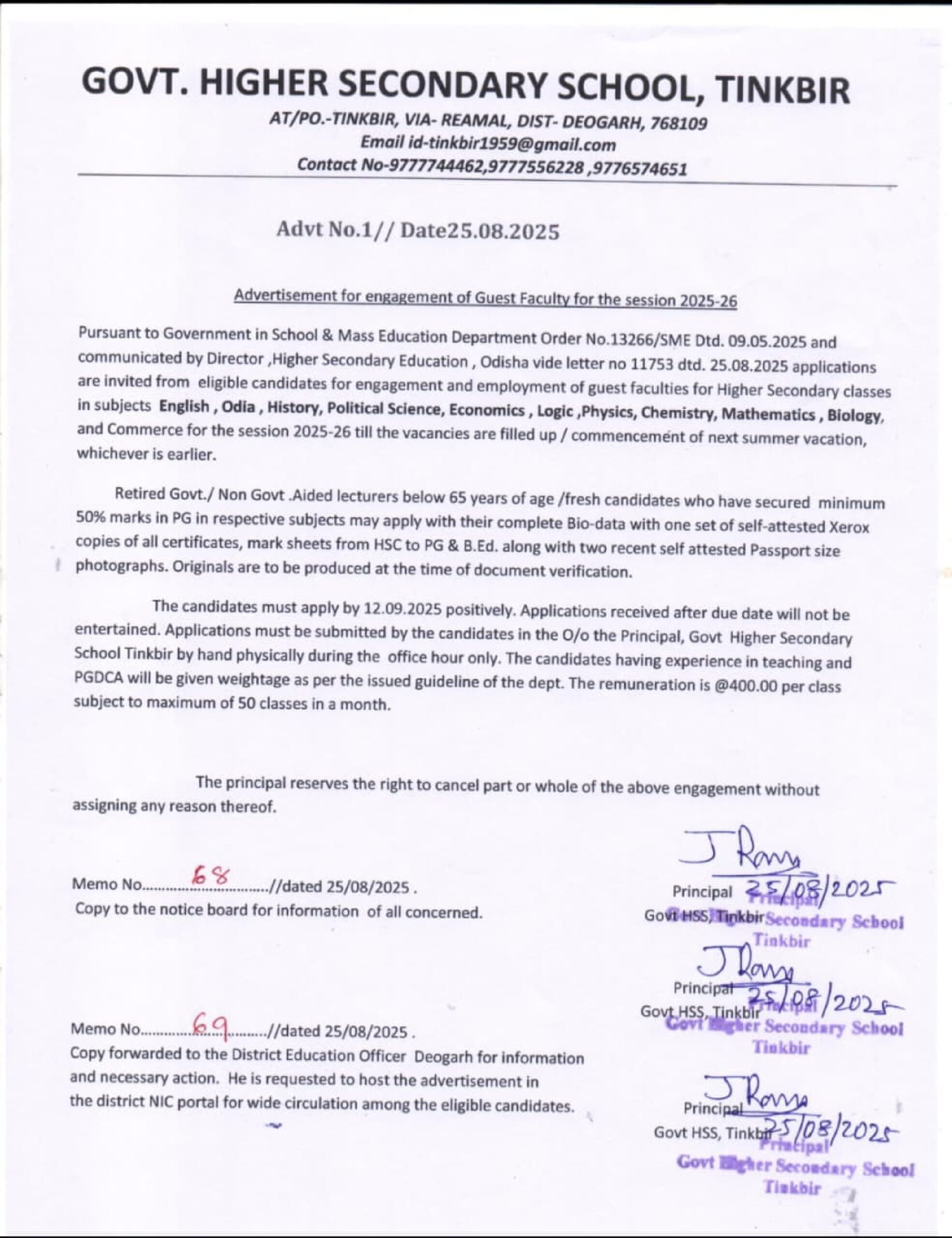 Govt. Higher Secondary School, Tinkbir, Odisha has released a notification for the engagement of Guest Faculty for the academic session 2025-26. This is a government contractual teaching job with an attractive honorarium. Candidates passionate about teaching in subjects like English, Odia, History, Economics, Physics, Chemistry, Mathematics, and more should not miss this golden chance. Apply confidently and take a step toward shaping young minds!