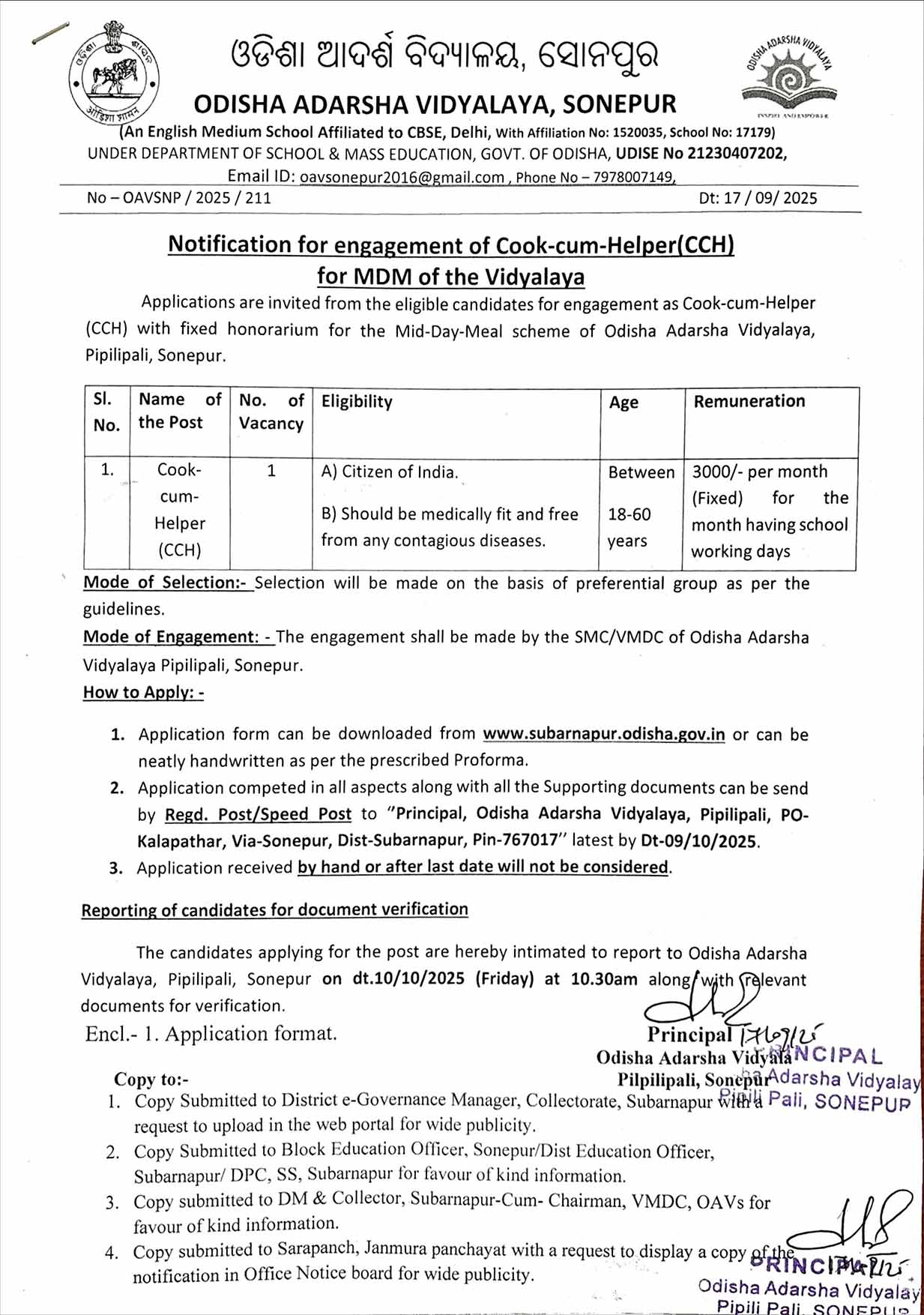 Odisha Adarsha Vidyalaya, Sonepur has released a notification for the engagement of Cook cum Helper (CCH) under the Mid-Day-Meal scheme. This is a government job opportunity in Odisha (Pipilipali, Sonepur district).
