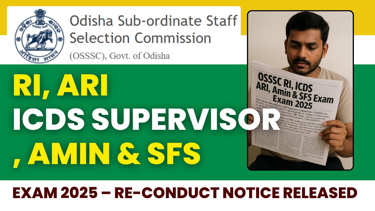 Odisha Sub-ordinate Staff Selection Commission (OSSSC) has announced the OSSSC Re-conduct Preliminary Examination 2025 for multiple posts including RI, ICDS Supervisor, ARI, Amin, and SFS under OSSSC Combined Recruitment Examination 2023 (IV). This exam will be held across Odisha districts. Candidates preparing for government jobs in Odisha should grab this opportunity and appear with confidence.